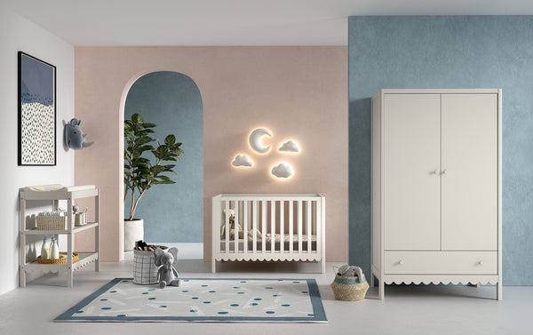 Onze 2-delige Dino babykamer van Jaxx verkrijgbaar in Nature of Wit is verkrijgbaar voor een speciale prijs inclusief bed (60x120cm) en commode.