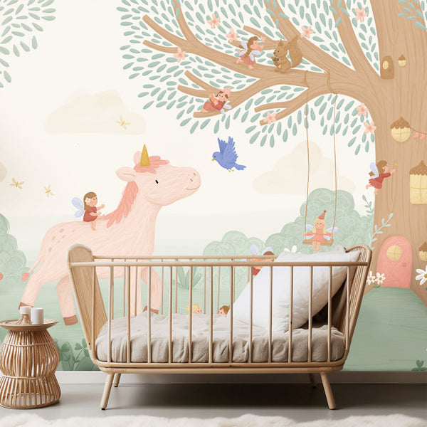 Creëer een betoverende meisjeskamer met ons unieke behang met deze lieve eenhoorn en elfjes. Dit magische feeënland behang brengt een fantasiewereld tot leven, waar sprookjesfiguren zoals eenhoorns, elfjes en bloemen de muren sieren. Perfect voor meisjes die houden van magie, avontuur en droomwerelden.