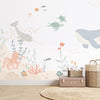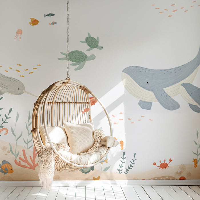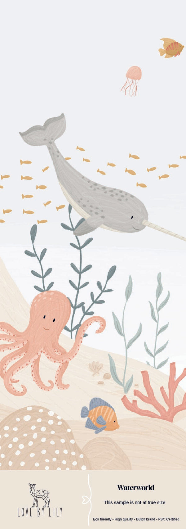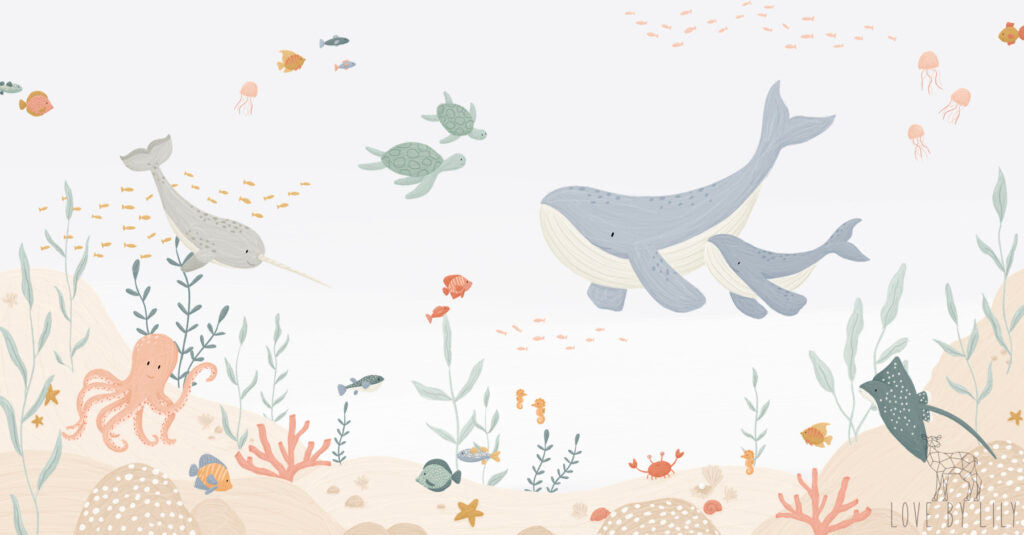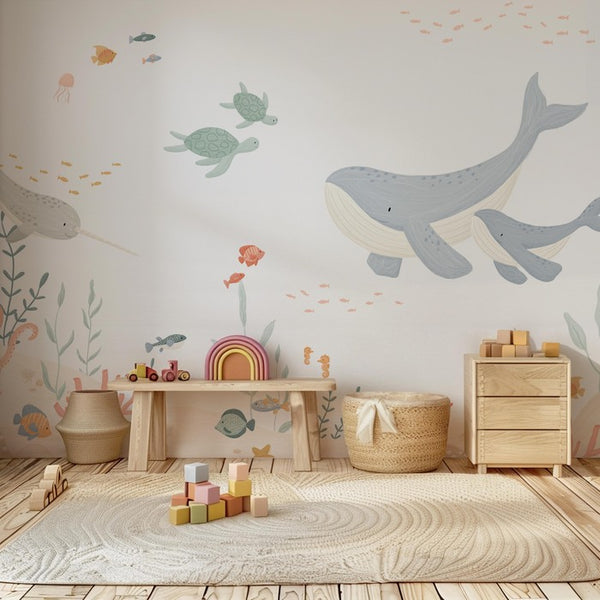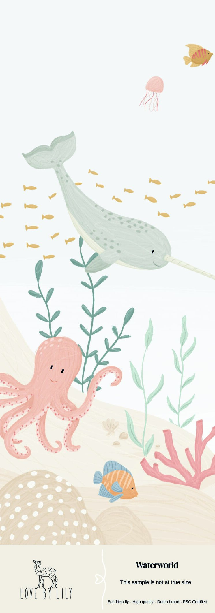 Breng de magie van de oceaan naar de kinderkamer met ons Waterwereld behang! Dit unieke behang neemt je kind mee op een betoverende reis onder water. Laat je meevoeren door de rust van de oceaan, waar walvissen zwemmen, vissen vrolijk rond dartelen en schildpadden kalm door het water glijden. Dit speelse onderwaterlandschap creëert een serene, maar avontuurlijke sfeer in de kinderkamer. Dit onderwater behang met walvissen, vissen en schildpadden is perfect voor kinderen die dol zijn op de zee en de natuur. De zachte kleuren en gedetailleerde illustraties brengen een rustgevende en verbeeldingsvolle omgeving in de kamer.