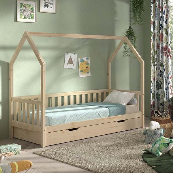 Het Cabane huisbed (90 x 200 cm) met hekje in de kleur natuur is vervaardigd in massief grenen. Het speelse design is een echte blikvanger elke kinderkamer. Dit bed beschikt over een hekje langs 3 kanten dat kan dienen als uitvalbeveiliging, maar dat ook ideaal is als zitbank. Maak het extra gezellig met kleurrijke kussens, dekentjes en een lichtslinger als decoratie.