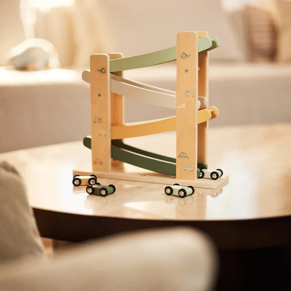 Wauw! Maak je klaar voor eindeloos speelplezier met deze fantastische houten racebaan, perfect voor jouw kleine avonturier! Met vier vrolijke autootjes die over de baan racen, past deze set prachtig in ons "On the Go"-thema en houdt hij jouw mini (en vriendjes) bezig, van de eerste bocht tot de finishlijn! Deze racebaan is natuurlijk ook een perfect kraamcadeautje!