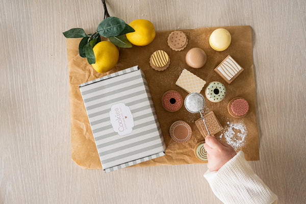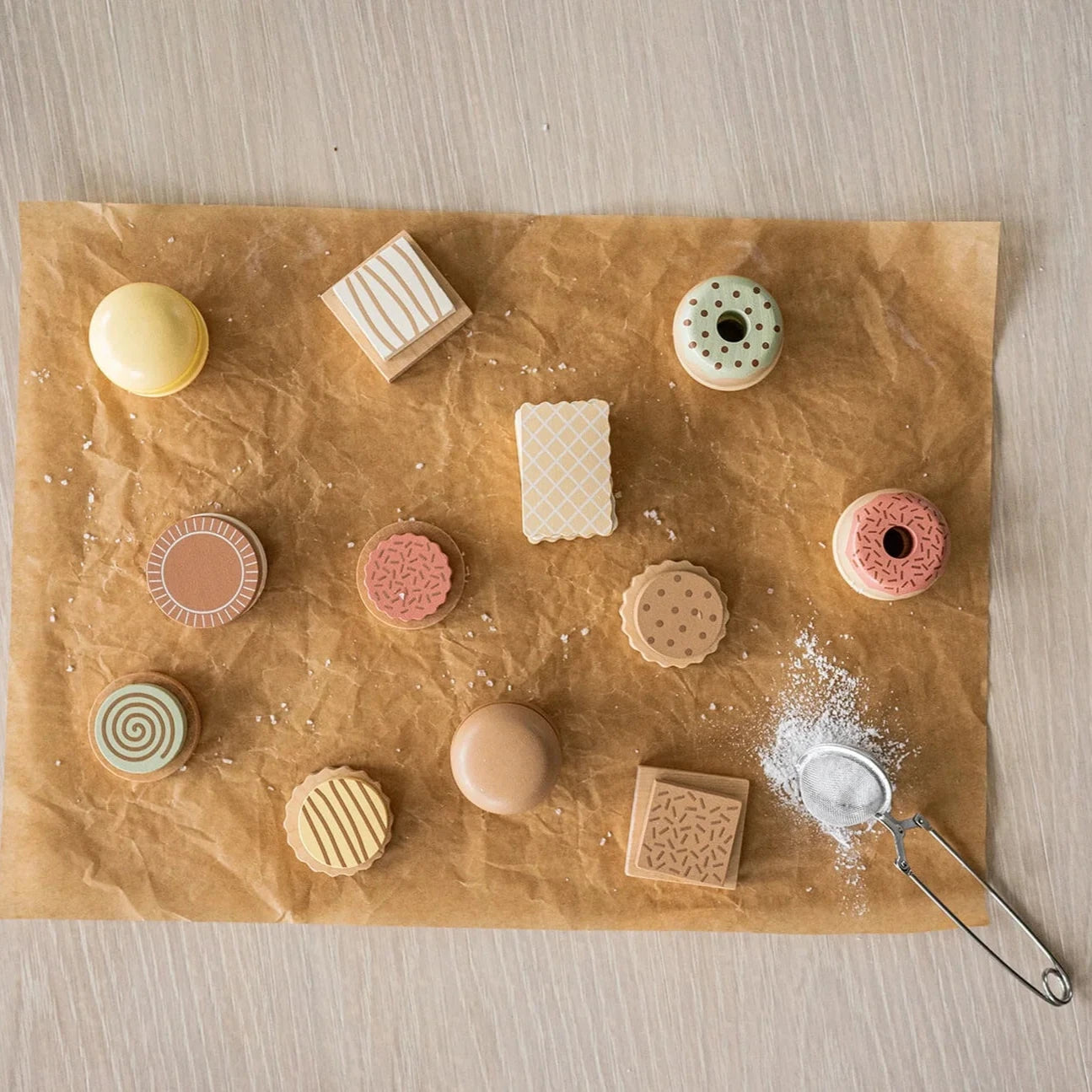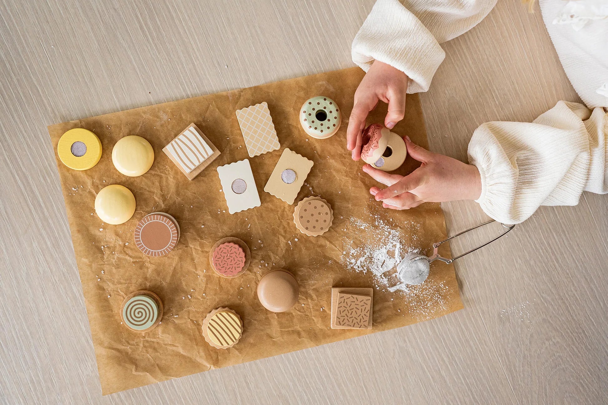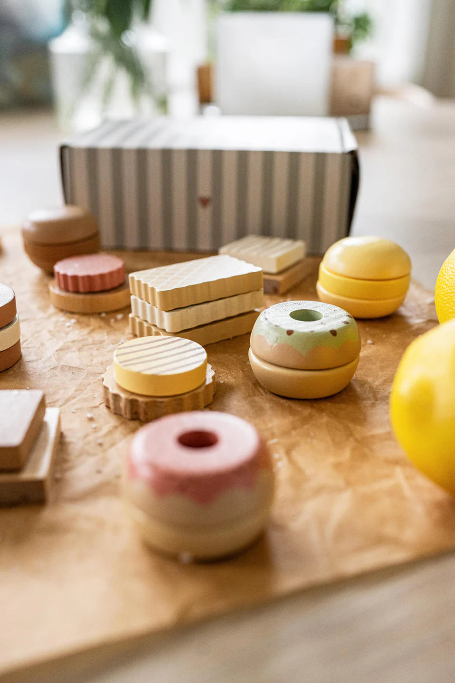 Stackable cookies speelgoedeten van Jabadabado met twaalf stapelbare cakes van hout perfect voor vele uren speelplezier.