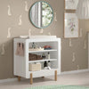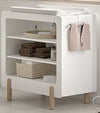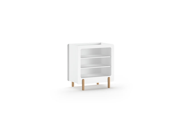 Deze witte commode uit de Smile-collectie combineert elegantie en functionaliteit met zijn tijdloze design, natuurkleurige ronde pootjes en twee handige legplankjes voor opbergruimte. Een stijlvolle toevoeging aan elke babykamer.