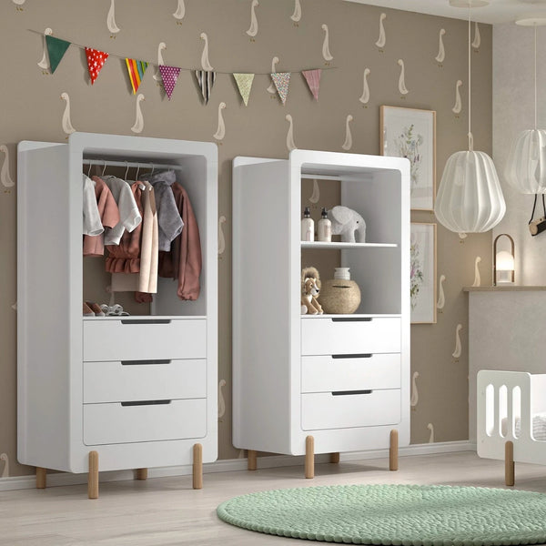 Een unieke combinatie van lades en open opbergruimte. Deze witte kast uit Smile-collectie met 3 lades en houten pootjes in natuurkleur. Deze strakke kast past in elke babykamer of kinderkamer en biedt veel opbergruimte. De houten pootjes zorgen voor een stijlvolle uitstraling en een open legruimte onder de kast voor decoratie. Je kan kiezen voor opbergruimte door gebruik te maken van de tussenplank, of juist babykleren op te hangen aan de kledingroede. Hoe leuk is dat! Soft-close op de lades.