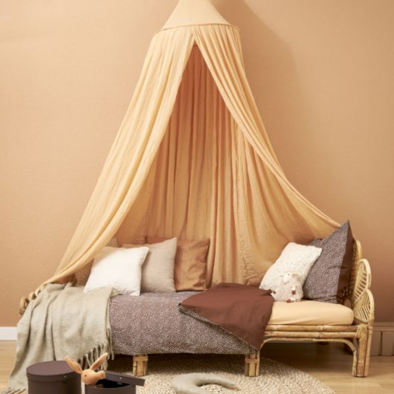 Niet alleen heel sfeervol in de baby-/kinderkamer, maar het geeft jouw kindje ook een veilig en geborgen gevoel. De bedhemel kan zowel over een wiegje, babybed, peuterbed of zelfs over een 1-persoonsbed gebruikt worden. Bij een 1-persoonsbed zal de klamboe niet het gehele bed kunnen bedekken, maar zal het als decoratie dienen en toch voor een beetje geborgenheid zorgen. Een sfeervolle decoratie die door middel van een lus op te hangen is aan een haak of plafond. Daarnaast biedt de klamboe ook goede bescherming tegen muggen. Beschikbaar in diverse kleuren. Hoogte is 240 cm, omtrek bovenkant is 55 cm en omtrek onderkant is 450 cm.
