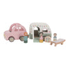 Laten we een droomreis maken en de weg op gaan! Ontdek de avontuurlijke wereld met de schattige roze auto met caravan en geniet van de vrijheid. Met de caravan maak je namelijk van elke plek een kampeerplek, waar je maar wilt. Of het nu de woonkamer, de speelkamer of de keuken is, haal de strandstoel tevoorschijn, pak de koffers uit en laat de 3 houten figuurtjes genieten van de omgeving.