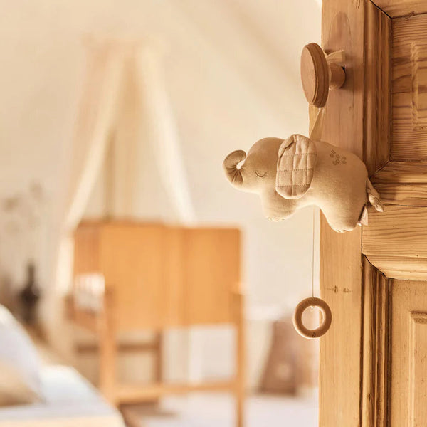 Deze schattige muziekhanger speelt een rustgevende lullaby en is perfect om je kleintje in slaap te helpen. De houten ring is bedoeld om het muziekje aan te trekken, terwijl het koordje het geheel mooi afmaakt. De oortjes hebben een schattig ruitprintje, en het zachte biscuit kleurige katoen zorgt voor een warme, zachte uitstraling. Een heerlijk rustgevende toevoeging aan de babykamer!