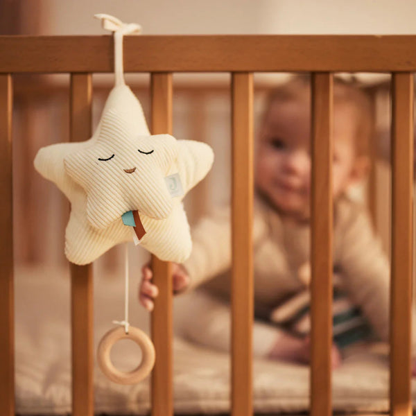 Shop deze mooie muziekhanger Star laat je kleintje genieten van de mooie klanken van het liedje lullaby van Schubert. Deze sterren in de vorm van een grote en een kleinere ster is voorzien van kleurrijke koordjes, geborduurde oogjes en een trekkoord om het muziekje mee te starten. Te leuk bij het bedje of de box.
