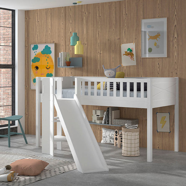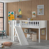 De wit gelakte Scott hoogslaper met glijbaan biedt een comfortabel slaapgedeelte bovenop een stevige constructie van massief Scandinavisch grenenhout. Het bed is uitgerust met een handige ladder aan de voorkant, waardoor het gemakkelijk is om naar boven te klimmen en het bed te bereiken. De ruimte onder het bed kan genuttigd worden als opbergruimte of een speelhoek. Eventueel aan te kleden met een leuke textielset. Stuur ons een berichtje voor de vele opties.