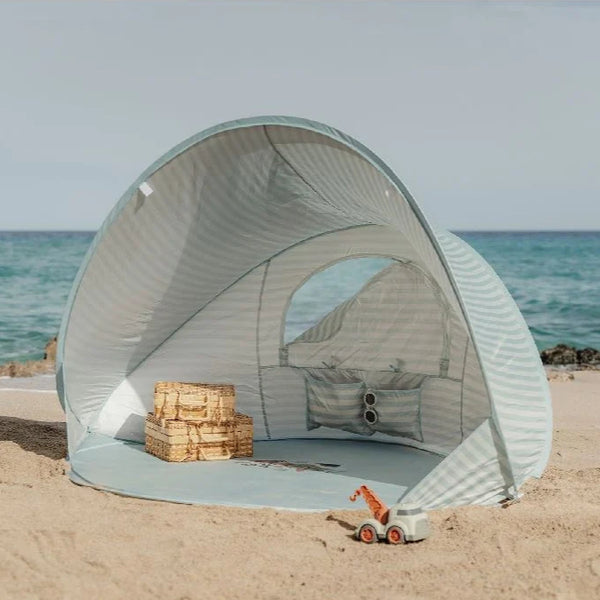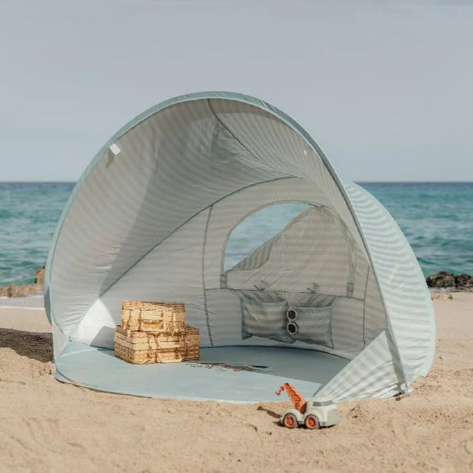 Hello Beach! Deze handige strandtent is ideaal voor elke stranddag. Onder de tent kan je lekker in de schaduw zitten terwijl je nog heerlijk kan chillen en spelen. In de tent zit een handig vakje waar je wat spulletjes in kan doen. De tent is gemakkelijk op te zetten en op te vouwen. Ideaal! De tent is perfect voor heel de dag zon, zee en strand. Gemaakt van 100% 210T polyester met een UV40-beschermingscoating. Formaat: 160 x 100 x 130 cm. Inclusief 4 haringen en een opbergtas.