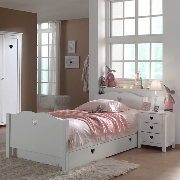 Het witte Amori-bed is gemaakt uit hoogwaardig MDF en heeft een romantische uitstraling, dankzij het hart in het hoofdbord en voeteinde en de sierlijke afwerking. De lattenbodem is inbegrepen.
