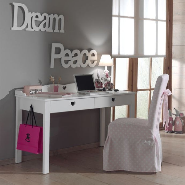 Amori witte bureau. Onder het bureaublad bevinden zich twee lades, naast elkaar, uitgerust met het SOFT-close systeem. Door de hartjes en de sierlijke afwerking, krijgt deze bureau een romantische uitstraling.