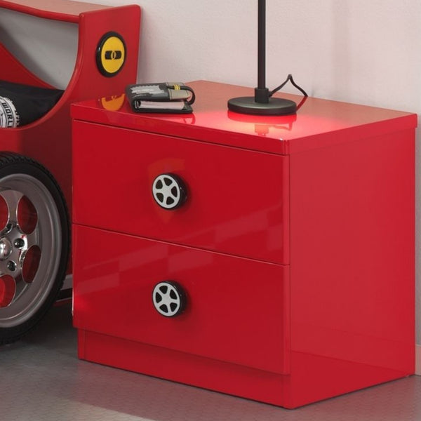 Dit Monza nachtkastje is vervaardigd uit rood gelakte MDF. Het nachtkastje heeft 2 lades die beschikken over een soft-close systeem. De lades hebben een kleine autoband als handvat. Perfect te combineren met een cool autobed.