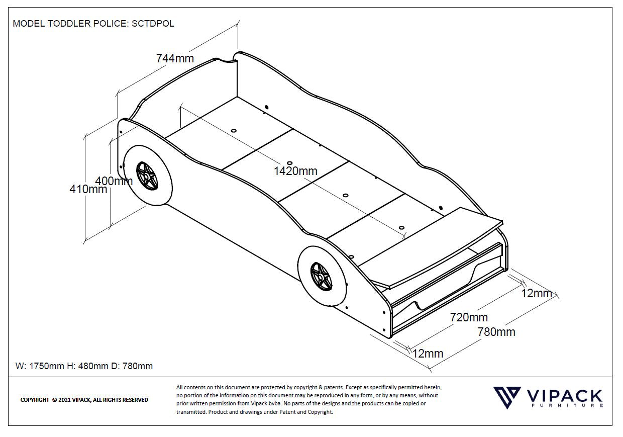 Dit peuter politie auto bed is vervaardigd uitblauw gelakte MDF. De lattenbodem is inclusief en is geschikt voor een matras van 70x140cm.