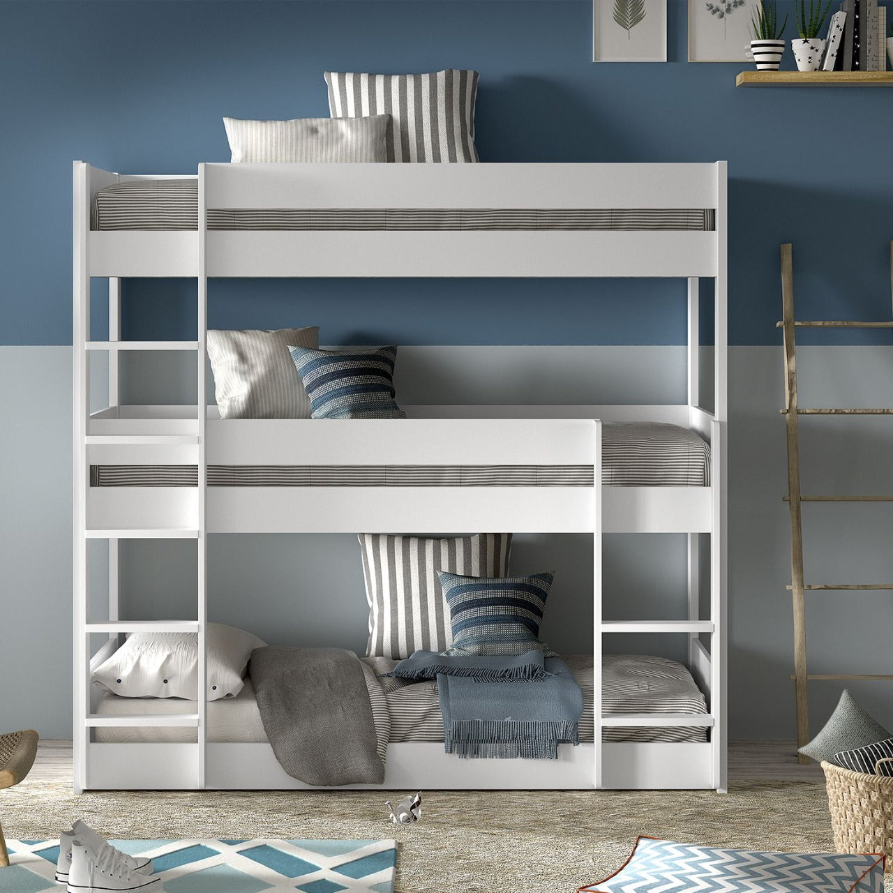 Niet 1, niet 2, maar 3 slaapplaatsen! Het Scott stapelbed is ontworpen met oog voor detail en functionaliteit. Dit stevige stapelbed is uitgevoerd in wit gelakt massief Scandinavisch grenen hout en MDF, wat zorgt voor duurzaamheid en een moderne uitstraling. Het is een slimme en stijlvolle oplossing voor al wie op zoek is naar ruimtebesparende slaapopties.